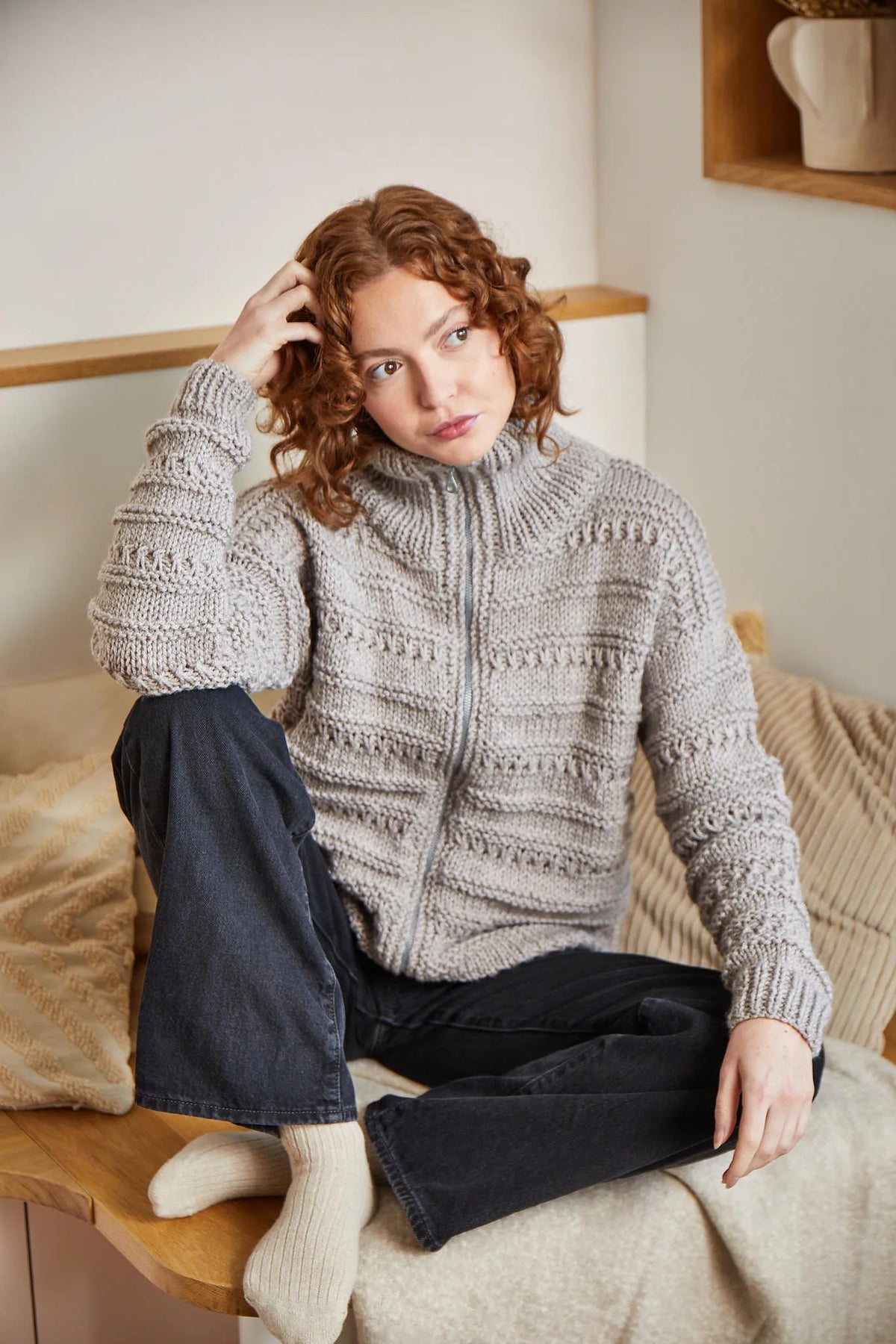 En utilisant des aiguilles de 6 et 6,5, les mailles alternent entre 1/1 côtes, point jersey, point mousse et point fantaisie, lui donnant son caractère, sa texture et son look signature. Le col haut rehausse discrètement le style, apportant structure et chaleur, tandis que la fermeture éclair ajoute une touche moderne et fonctionnelle. La laine BARISIENNE est utilisée pour tricoter un col avec des aiguilles de 3,5, qui cache discrètement l'arrière de la fermeture éclair.