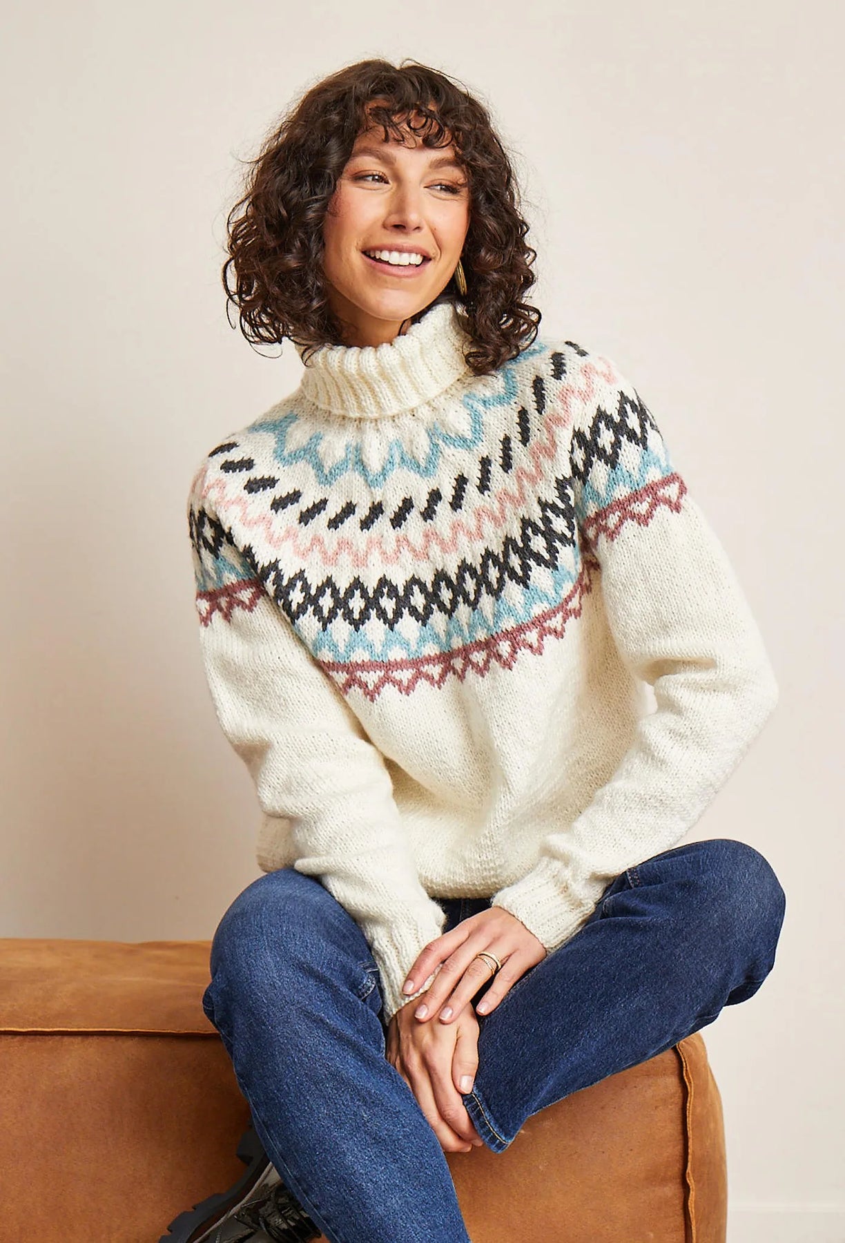 Pull empiècement jacquard col montant, disponible du S au XXL. Laissez-vous séduire par ce pull élégant et coloré, tricoté en DOUCELAINE, idéal pour toutes les saisons. Son empiècement jacquard délicatement travaillé apporte une touche originale et raffinée, tandis que le col montant assure confort et chaleur. Les côtes 2/2 et le jersey endroit sont faciles à réaliser, et pour un jacquard parfaitement net, nous recommandons l'usage des aiguilles circulaires 50 cm n° 5. Un modèle qui allie style, confort et plaisir de tricot, parfait pour se faire plaisir ou pour offrir un cadeau fait main unique.