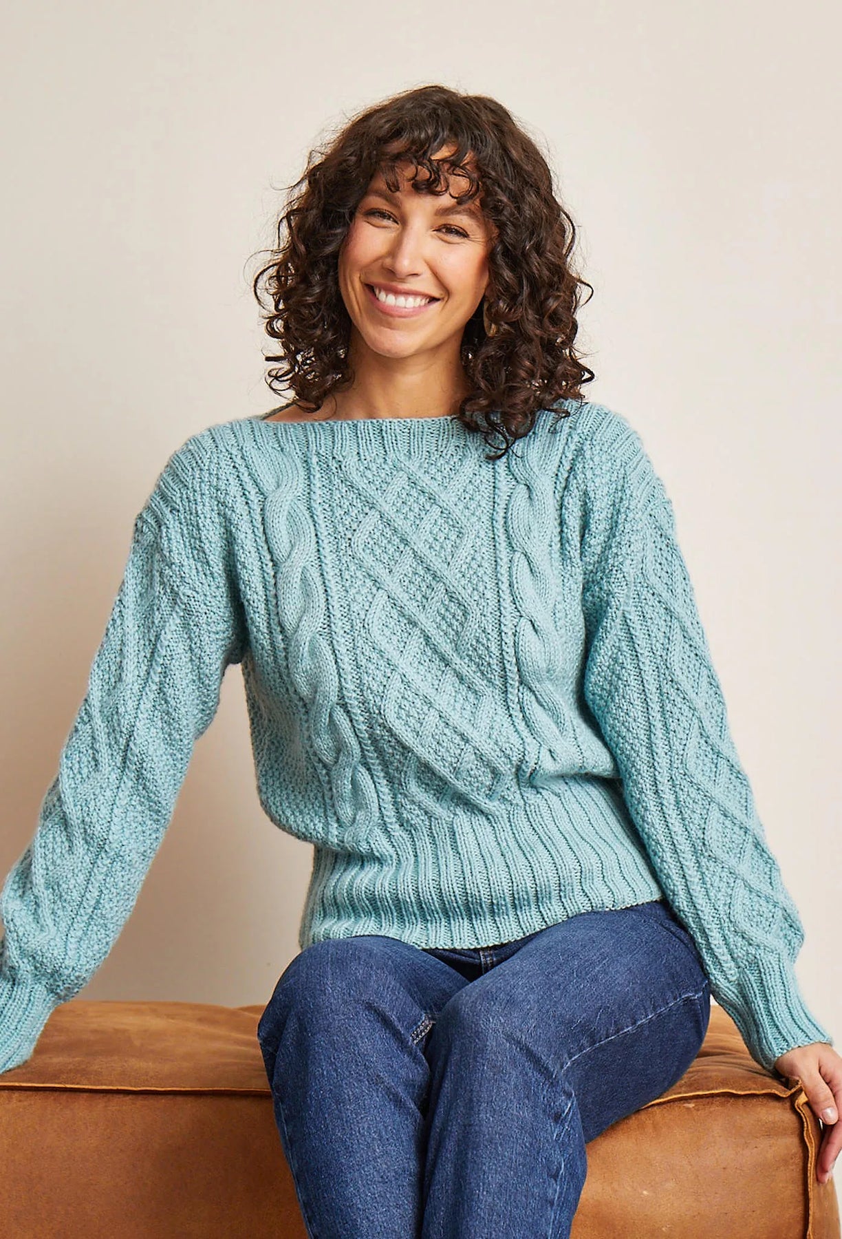 Réalisé en DOUCELAINE, un fil doux et agréable sur la peau. Tricoté aux aiguilles n°4,5, il combine côtes 2/2, point de blé et torsades sur le devant, pour un relief subtil et une texture régulière.