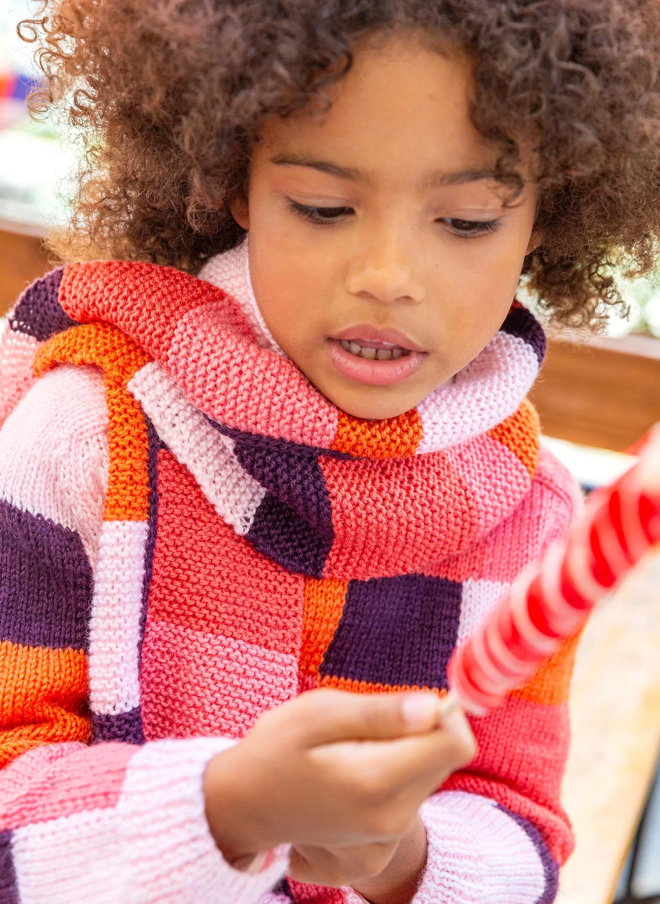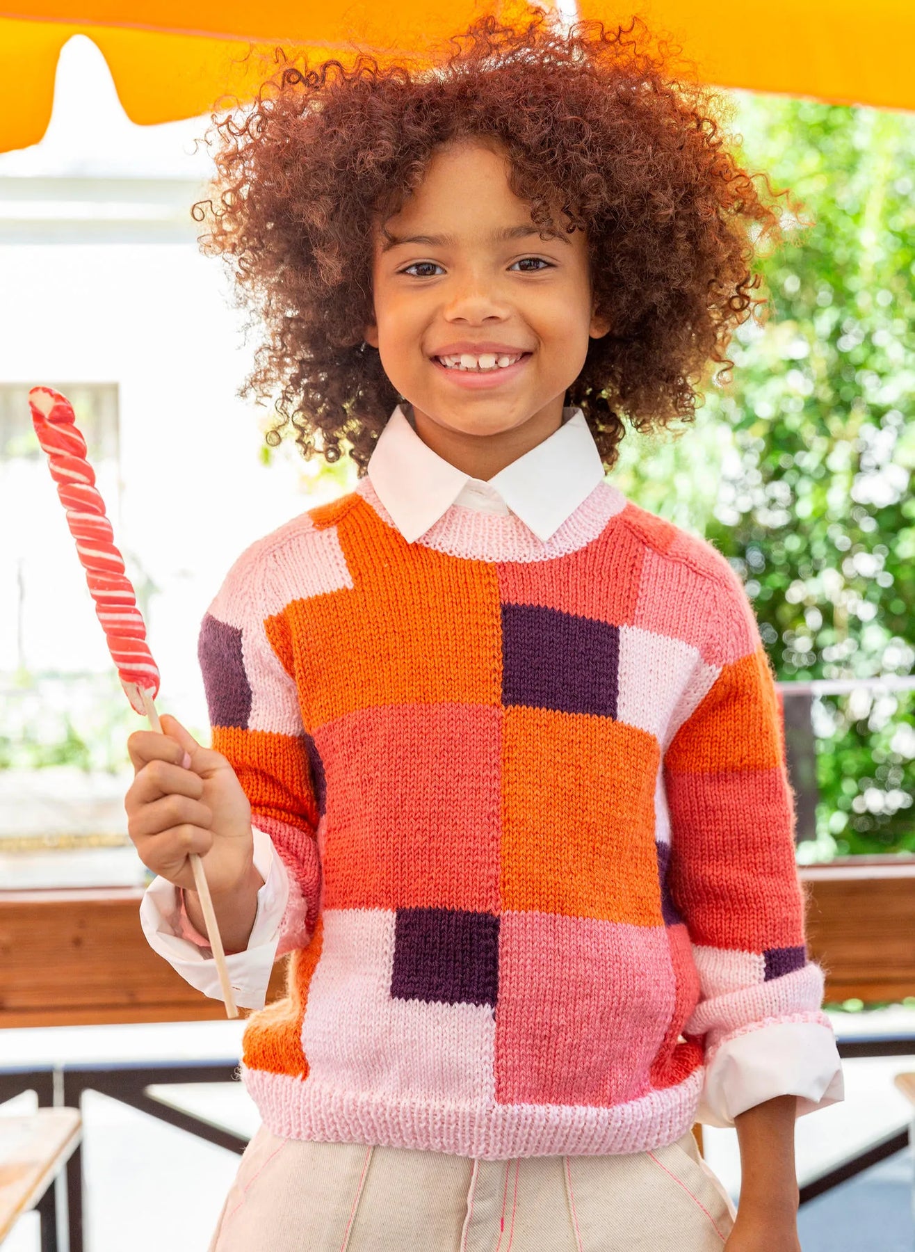 Un patchwork de couleurs pour ce pull à col rond avec manches martelées en fil IDEALE 4. Tricotez des carrés et des losanges avec de petites navettes pour éviter d'emmêler vos pinceaux.