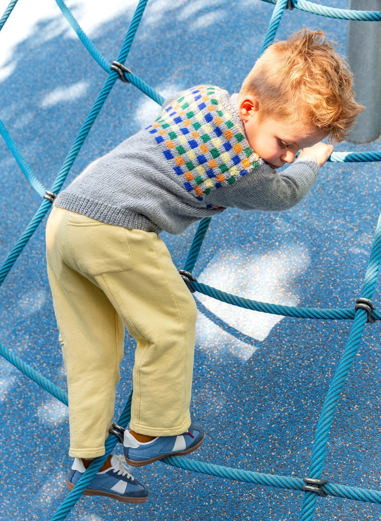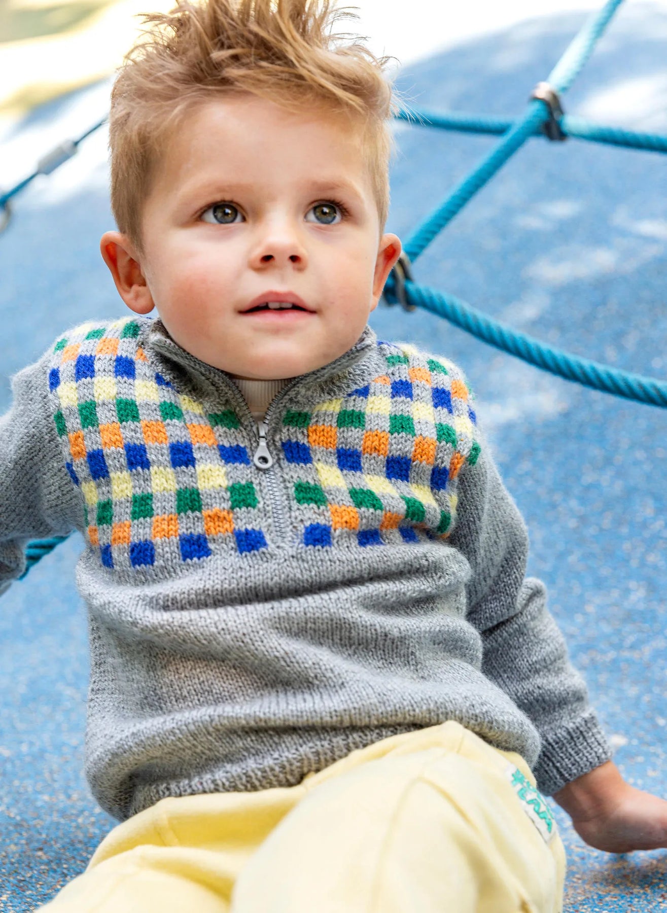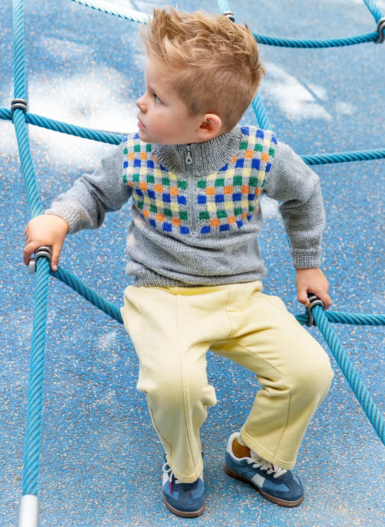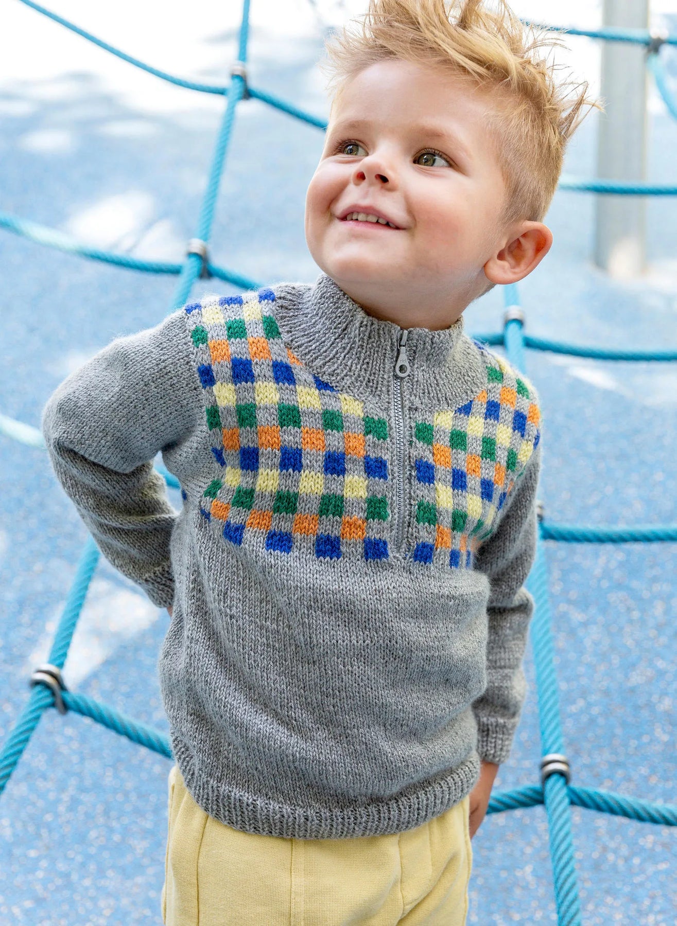 Pull jacquard tricoté avec le fil IDÉALE BB. Nous adorons son motif damier et son col camionneur zippé. Il est léger et fin, mais grâce à la laine mérinos dans ce fil, il est chaud, douillet et doux à la fois. Portez-le aussi souvent que vous le souhaitez.
